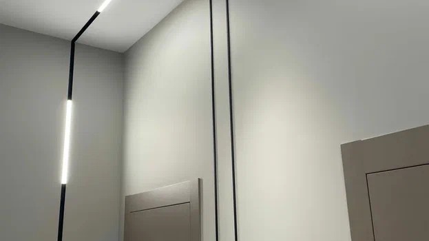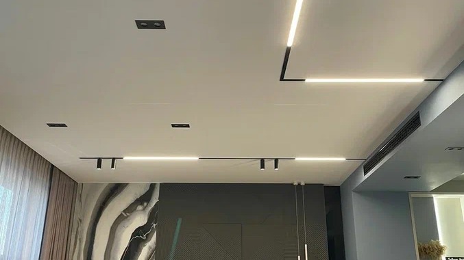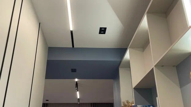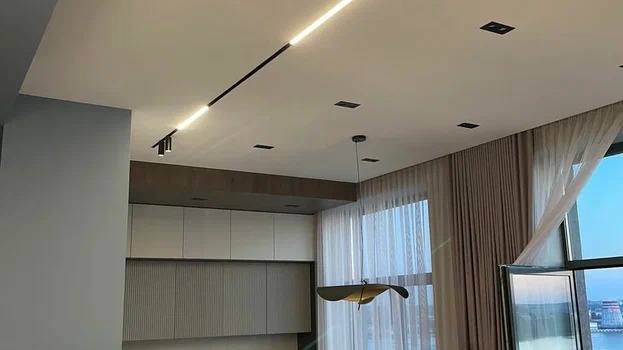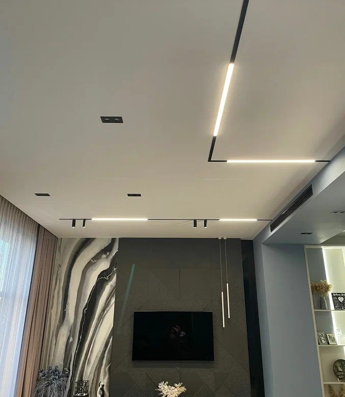 Потолок здесь выполнен из гипсокартона с использованием треков 80001-2M-BK, которые могут быть инсталлированы в разных плоскостях в единой системе благодаря оригинальным технологическим решениям и простой конструкцией сборки.
