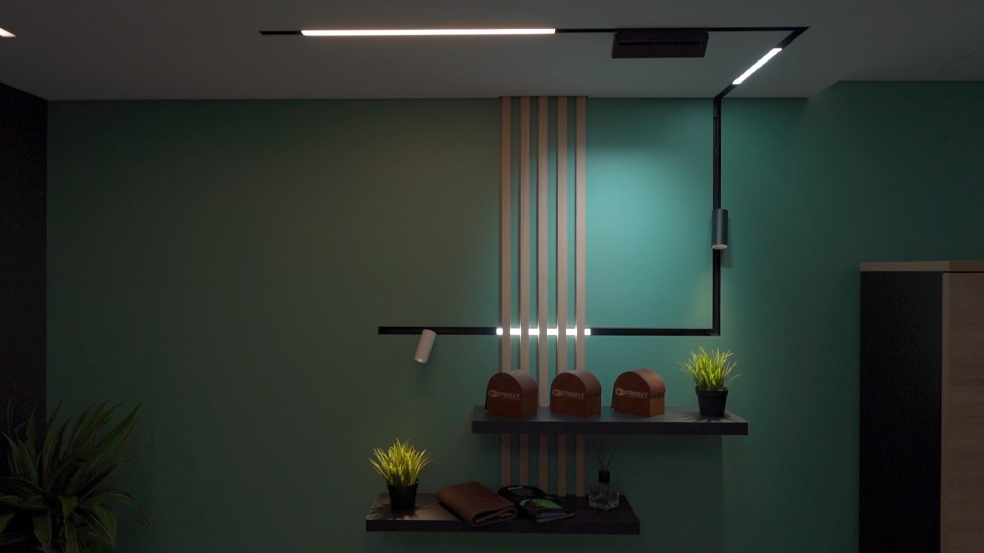 «Идею для нового офиса предложил наш менеджер Иван, а потом и вся команда OnProekt (https://onproekt.ru) подключилась: обсуждения, корректировки… Главное, что удалось соединить рабочее пространство и наглядную демонстрацию интеграции потолочных решений и возможностей освещения. Это полностью законченный проект, в котором всё получилось идеально!»